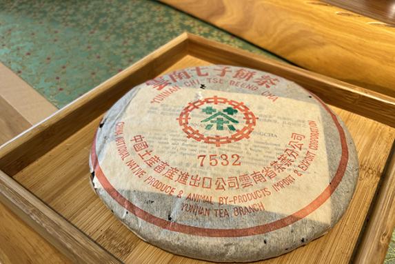 今日【艾老师选茶】栏目推荐的这款茶,这是在龑王家二分店开业之际时,当日举行的老茶品鉴会茶品之一,即1993年的7532水蓝印青饼(也称雪印青饼)。